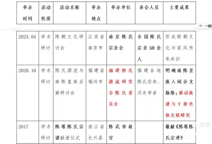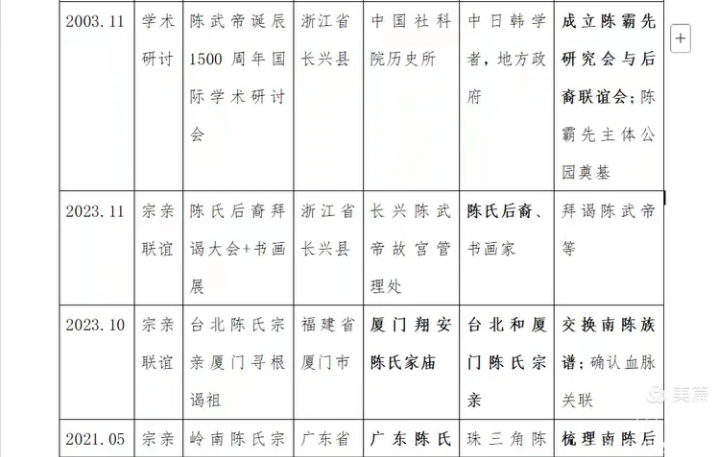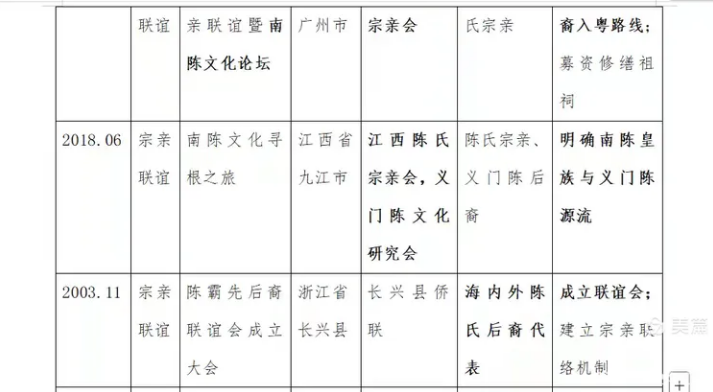 在上表中诸如此类的与南陈有关的活动中,可以联系举办方或某参加人,获取花名册、通讯录、纪念册等与参加活动的南陈后裔有关名录、通讯方式有关资料,以及获取南陈后裔组织信息,可以大大推动寻找南陈存续支系和南陈后人的进展。