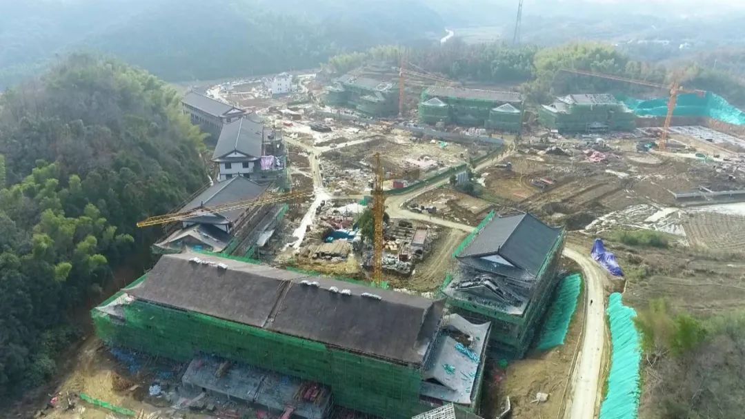 在江西省九江市德安县车桥镇义门村,一栋栋仿古建筑正在紧张施工,塔吊林立、机器轰鸣,水泥罐车、物料车排队出入,施工人员忙碌有序地进行作业,总投资112亿的义门陈文化产业园项目一期(家风寻根园)从地基开挖,历经短短7个月,逐步成形。