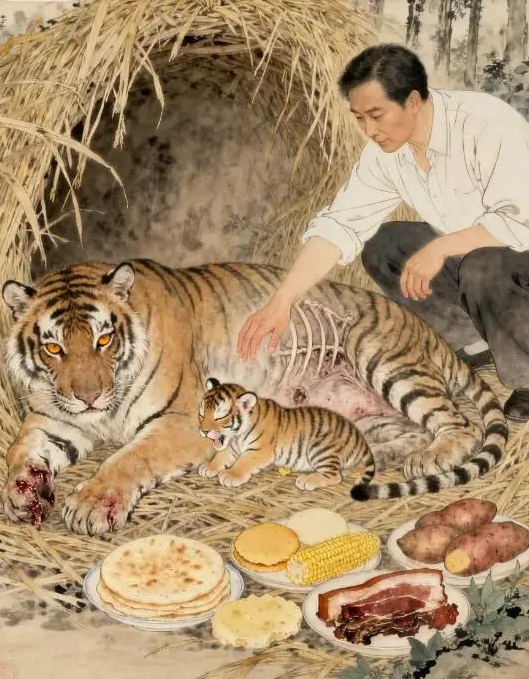 “看这样子,母虎怕是好几天没吃东西了,还受了伤。” 陈松摸了摸怀里的布包,里面是妻子早起烙的麦饼和煮好的米饭。他掏出布包,把米饭和麦饼倒在一片干净的树叶上,推到母虎面前。母虎起初还犹豫,可肚子饿得咕咕叫,最终还是抵不住诱惑,拖着病体挪过去,大口地嚼了起来。麦饼的香气飘散开,两只小虎崽也凑过来,围着母虎的嘴蹭食。