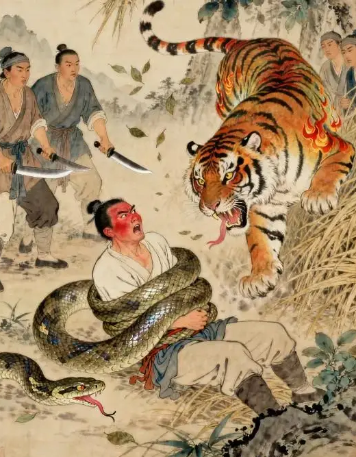 “救命!哥,救命啊!” 陈光的声音被勒得断断续续,脸涨得通红,呼吸越来越困难。陈松和兄弟们听到呼救,赶紧冲过来,可巨蟒缠得太紧,他们拿着砍刀不敢乱砍,怕伤了陈光。就在这危急关头,一阵虎啸响彻山林,震得树叶簌簌落下。