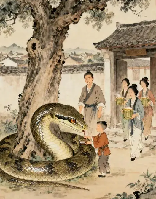 接连三天都是如此,陈松送出去,巨蟒又自己回来。陈家人见它实在不愿离开,便索性留它看家护院。巨蟒似乎也懂了,每天盘在院门口的老槐树下,见了陌生人就抬起头,吐着舌头发出“嘶嘶” 声,吓得人不敢靠近;见了陈家人,就温顺地垂下头,任由孩子们摸它的鳞片。