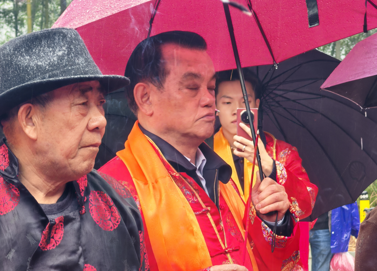行至墓前开阔处,队伍缓缓立定。陈朝晖走上前,雨声忽然静了些:“今日,陈氏宗亲跨越山海聚于此,共祭先祖,有请陈进弟会长为先祖致辞!”