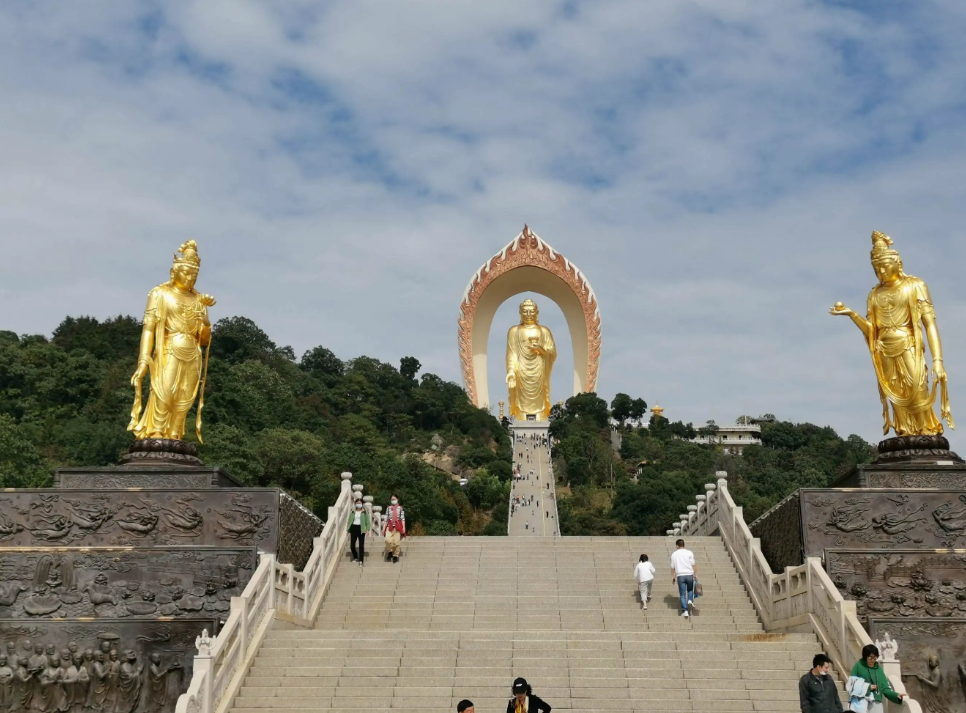 四十八米阿弥陀佛接引圣像表达“愿我临欲命终时,阿弥陀佛远相迎”的情景。吾人睹见此圣像,便可领悟到阿弥陀佛平等救度我等众生的愿心,引发吾人信愿持名,蒙佛金色手臂的接引,往生到极乐世界。