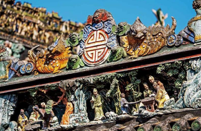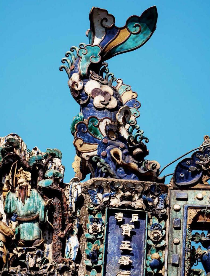 广州陈氏书院陶塑脊饰“鳌鱼”鳌鱼是大海中的神兽,龙头鱼尾,好吞火。屋脊上的鳌鱼装饰有防火之意。科举考试中又将状元及第称为“独占鳌头”,暗含对子弟学业有成的美好祝愿。