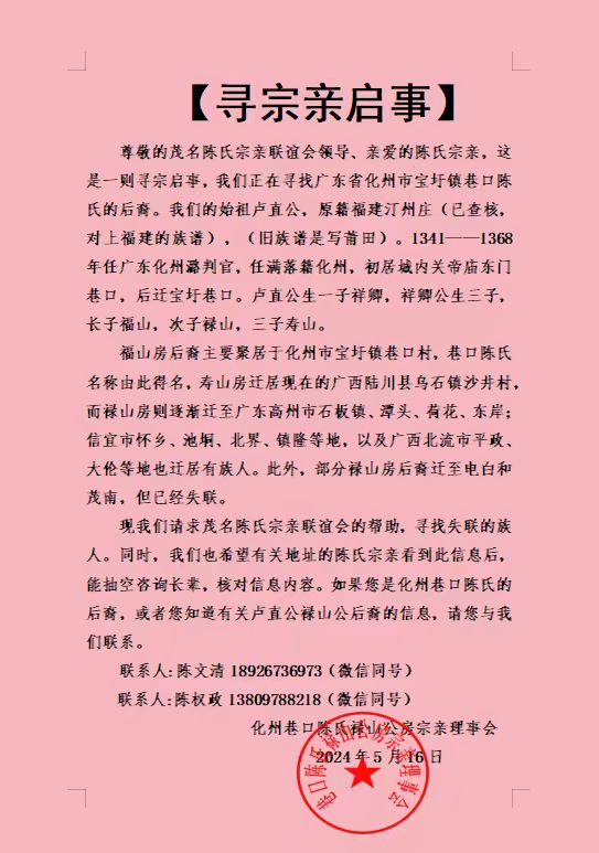 尊敬的茂名陈氏宗亲联谊会领导、亲爱的陈氏宗亲,这是一则寻宗启事,我们正在寻找广东省化州市宝圩镇巷口陈氏的后裔。我们的始祖卢直公,原籍福建汀州庄(已查核,对上福建的族谱),(旧族诺是写莆田)。1341–1368年任广东化州潞判官,任满落籍化州,初居城内关帝庙东门巷口,后迁宝圩巷口。卢直公生一子祥卿,祥公生三子,长子福山,次子禄山,三子寿山。