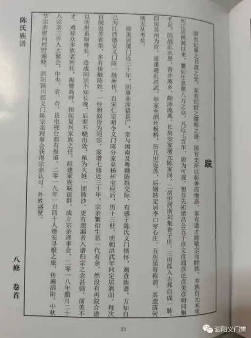【谱牒身之本也】,盛世修谱兹事体大,修谱宗亲同心同德、众志成城,心怀公平,身体力行,诚为族人典范。泗阳颖川郡义门陈泱泱大族,我们共同携手,把家族大业做大做强!