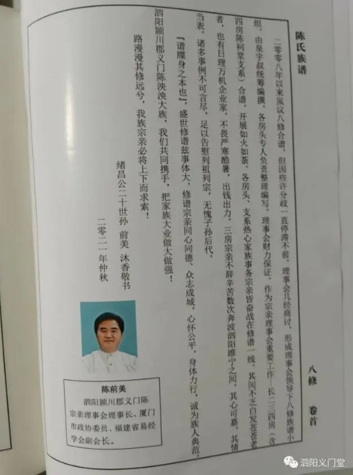 前美居厦门近三十年,因事业涉猎甚广,常与闽南及粤赣陈姓交际,有感于陈氏义门情怀,遍查族谱,方知自己为江西德安义门陈一脉所传,自宋仁宗昭令义门陈分家至扬州宝应后,历十三世,明朝洪武年间定居泗阳。每次自闽返苏省亲,多有接触陈姓,一经相叙皆为同宗。家谱七修近三十年,宗亲繁衍生息一代有余,然没有再叙合谱以明世系辩尊长。造成同宗不知长晚,后辈不晓出处,虽为大姓一团散沙。更有遗漏者入谱归宗之念甚强。前美不才,难辞众多族老所托,振臂高呼,担起复兴家族之任。组建家族联谊群,成立宗亲理事会,二零一八年腊月二十八宗亲三百人大聚会,中央、省、市、县电视台都有报道。二零一九年一百四十人德安寻根之旅,传遍泗阳。中秋节宗亲慰问村野遍晓。泗阳颖川郡义门陈宗亲理事会获得宗亲认可、外姓盛赞。