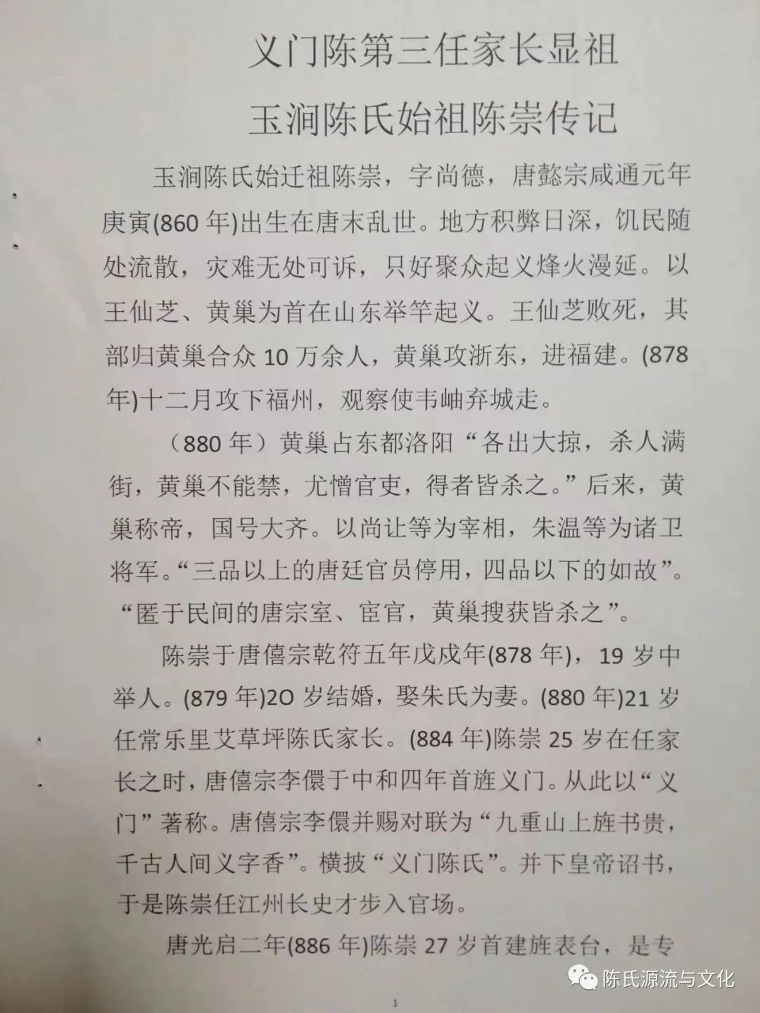 玉涧陈氏始迁祖陈崇,字尚德,唐㦤宗咸通元年庚寅(860年)出生在唐末乱世。地方积弊日深,饥民随处流散,灾难无处可诉,只好聚众起义烽火漫延。以王仙芝、黄巢为首在山东举竿起义。王仙芝败死,其部归黄巢合众10万余人,黄巢攻浙东,进福建。(878年)十二月攻下福州,观察使韦岫弃城走。