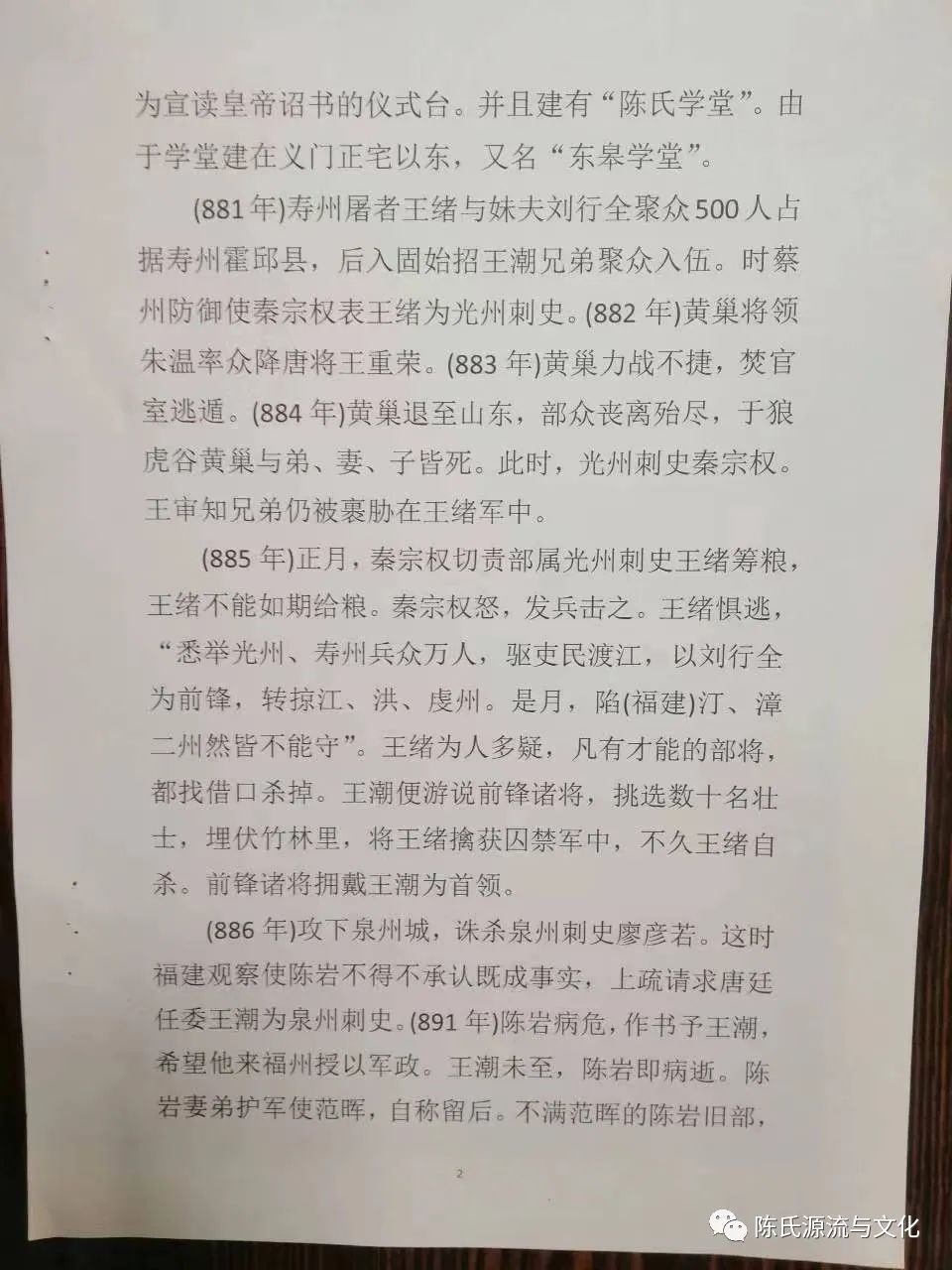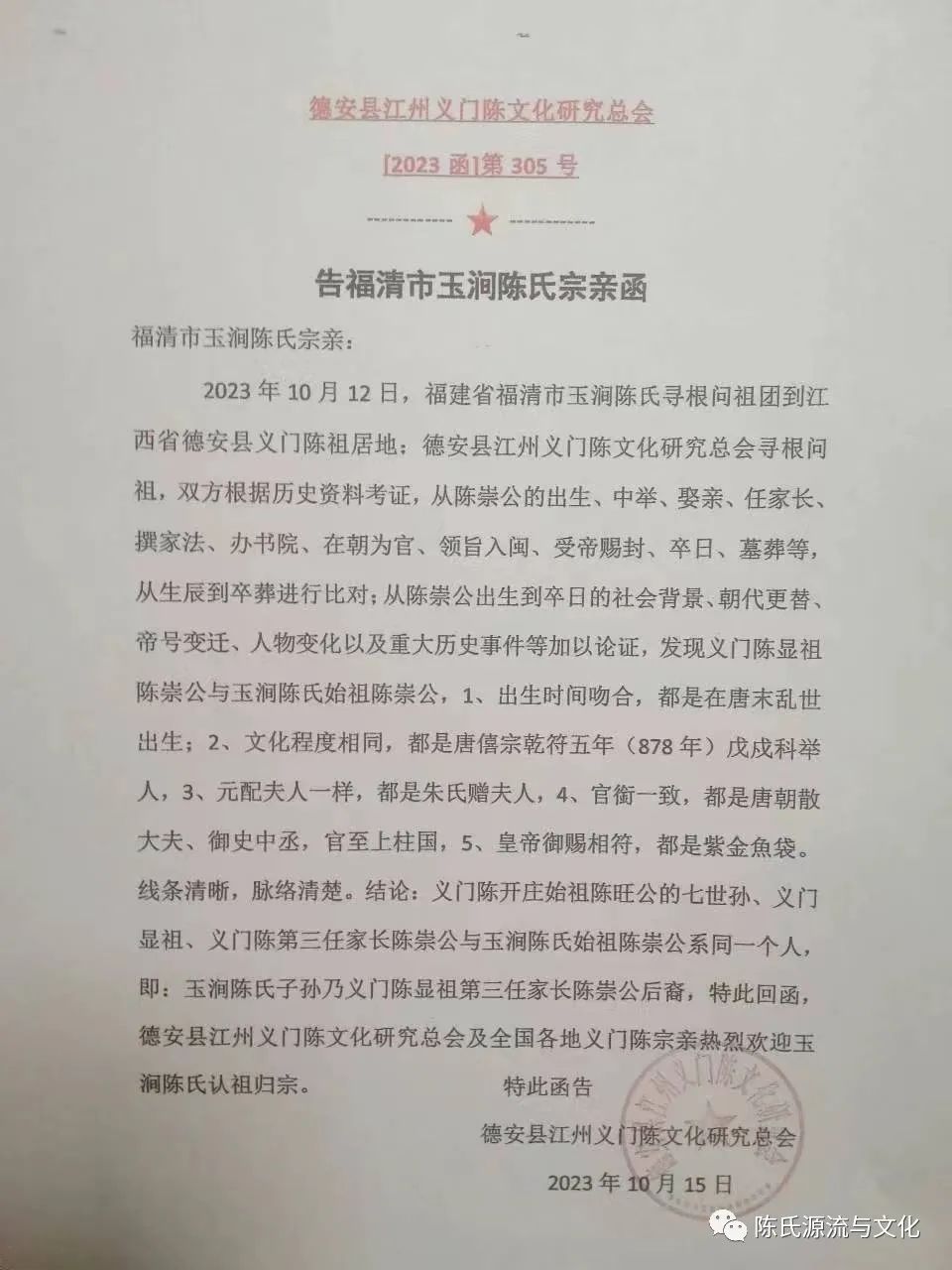 (894年)陈崇35岁,将儿子(即:玉涧二世祖)托付给在闽为官的陈姓朋友关照,自己要回朝廷复命福建情况。经唐帝同意回义门陈老家“续弦”洪氏,生子有三:枋、衮、让。