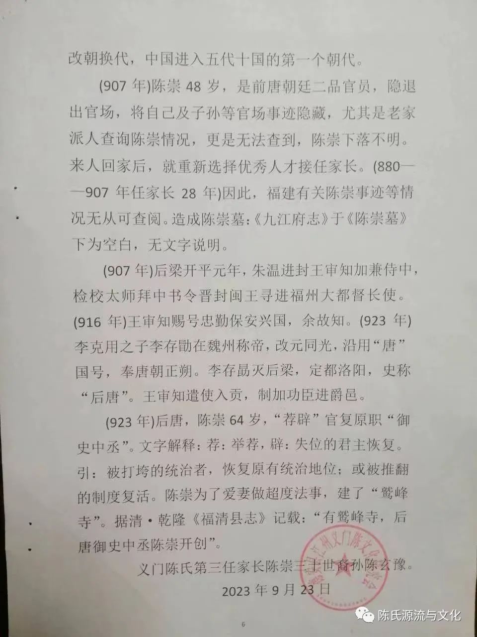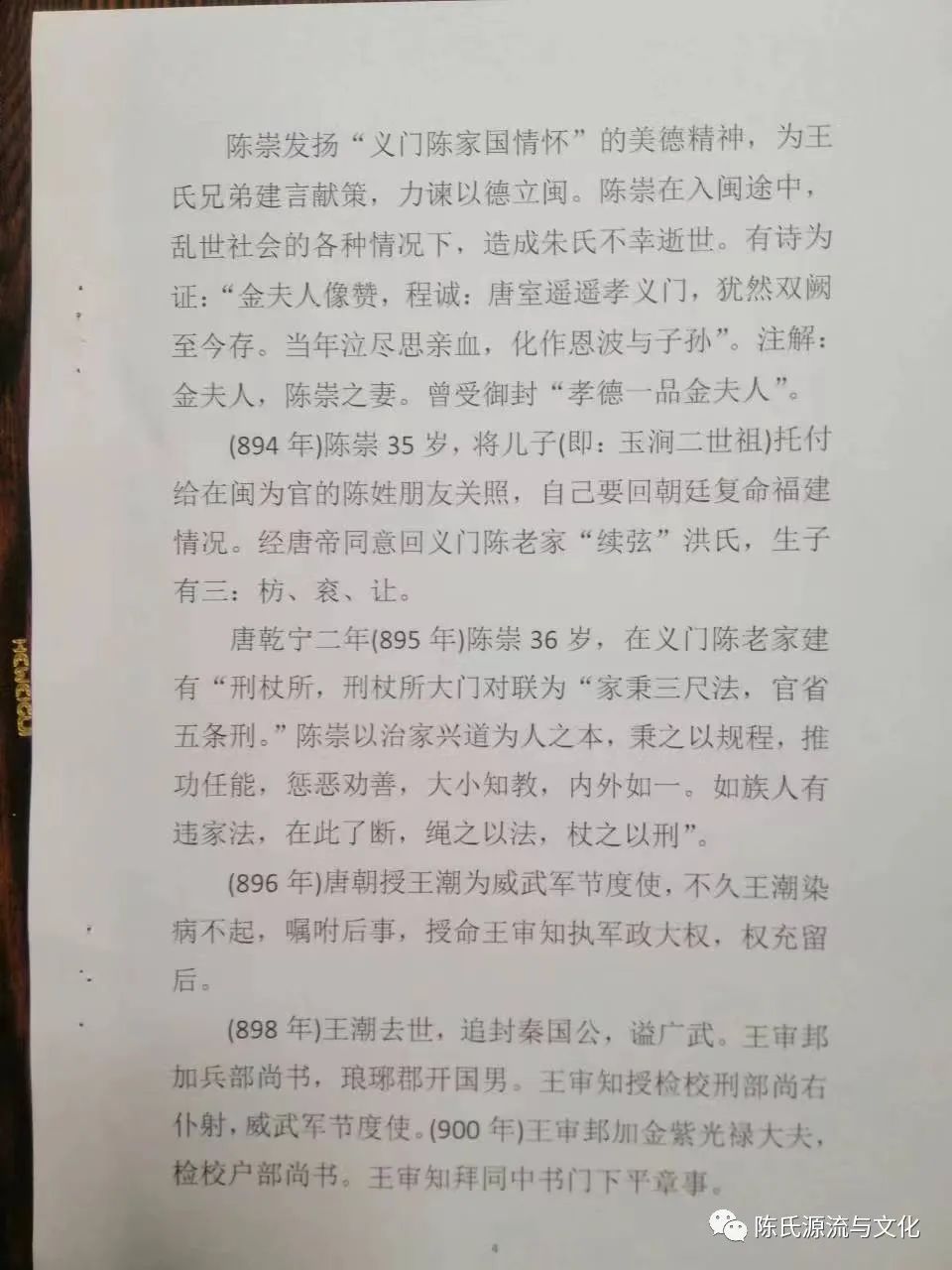 唐大顺元年庚戌(890年)陈崇31岁身为“银青光禄大夫、检校右散骑常侍、兼御史大夫,上柱国赐紫金鱼袋臣陈崇谨撰《家法三十三条》、《家范十二则》、《家训十六条》。