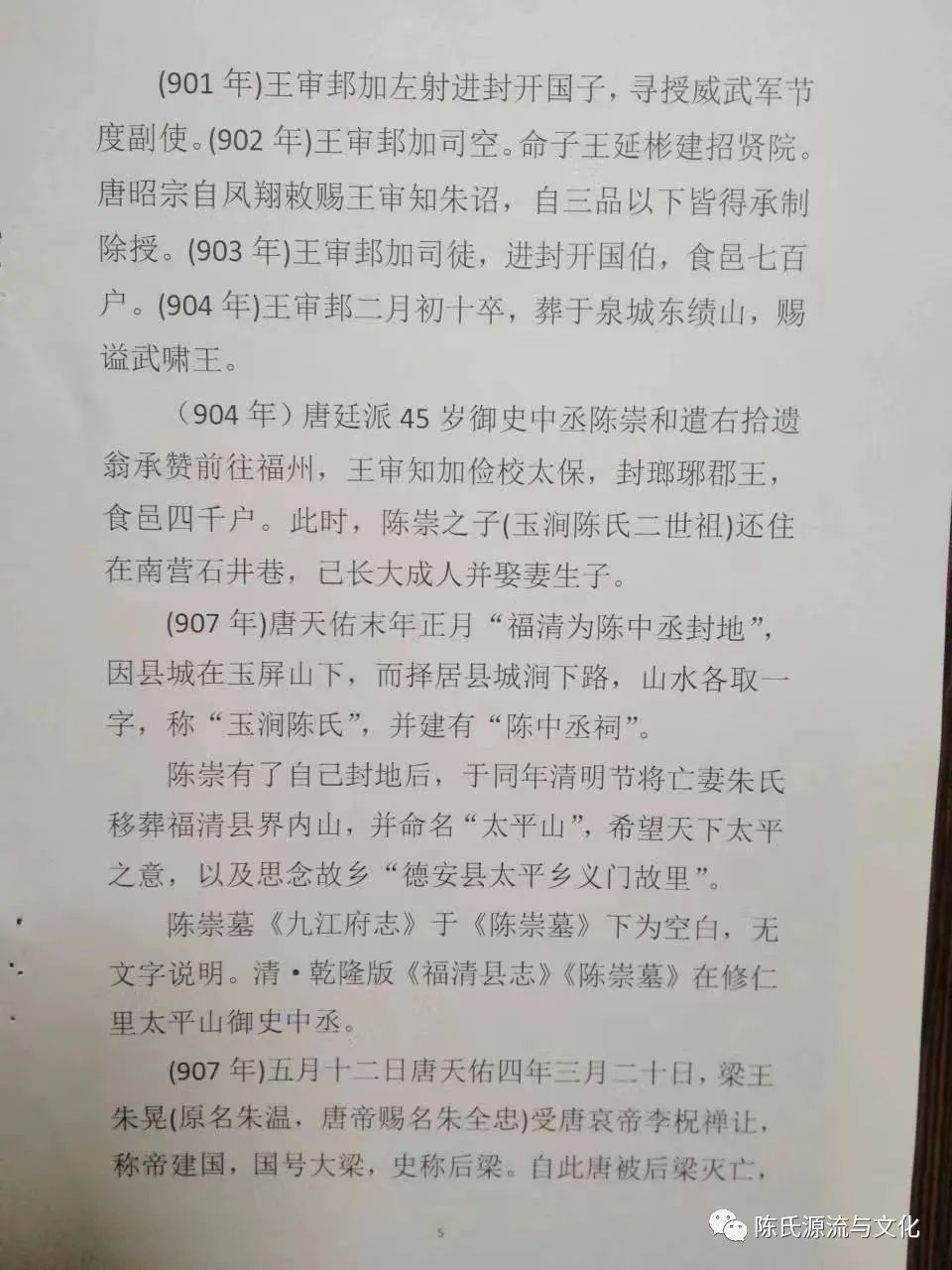 (904年)唐廷派45岁御史中丞陈崇和遣右拾遗翁承赞前往福州,王审知加俭校太保,封瑯琊郡王,食邑四千户。此时,陈崇之子(玉涧陈氏二世祖)还住在南营石井巷,已长大成人并娶妻生子。
