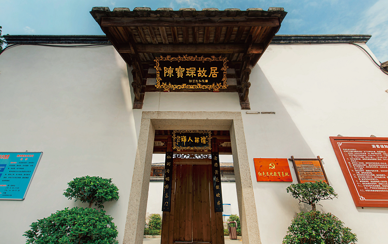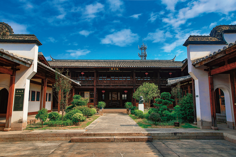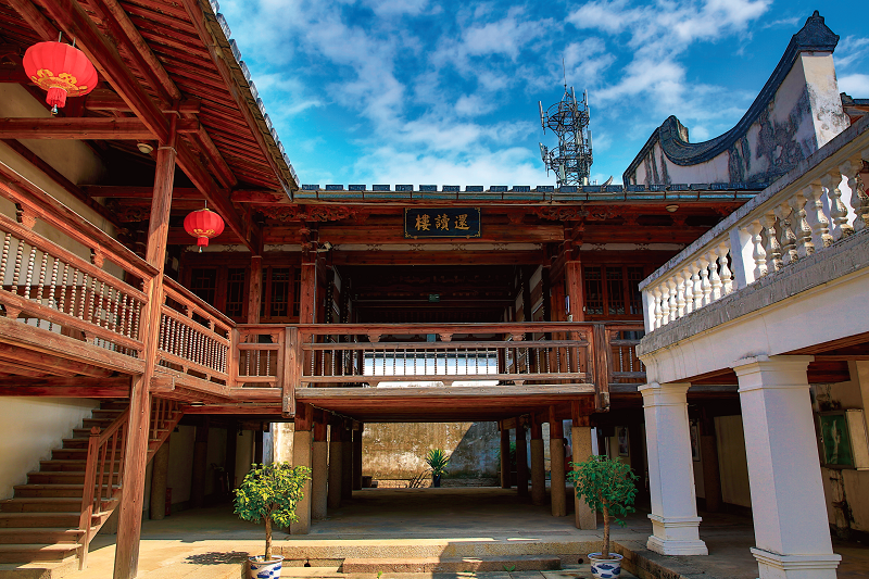 沿大道行至北端上三级石阶,踏通财石即至赐书楼。赐书楼坐北朝南、面阔七间,为歇山顶穿廊式双层楼阁。楼阁两侧为传统马鞍顶山墙,白砖灰瓦,清丽舒朗。整体建筑飞檐翘角,大气间不失秀美。楼内文气氤氲,楼匾为乾隆朝内阁学士翁方钢手书“赐书楼”,厅前梁柱挂陈宝琛手书“传家先志节,报国持精神”黑底金漆楹联一对。一楼中堂有郑板桥风竹图为堂画,陈宝琛手书曾祖陈若霖家训“常存厚道以培家运,勿因小忿而失至亲”为堂联。