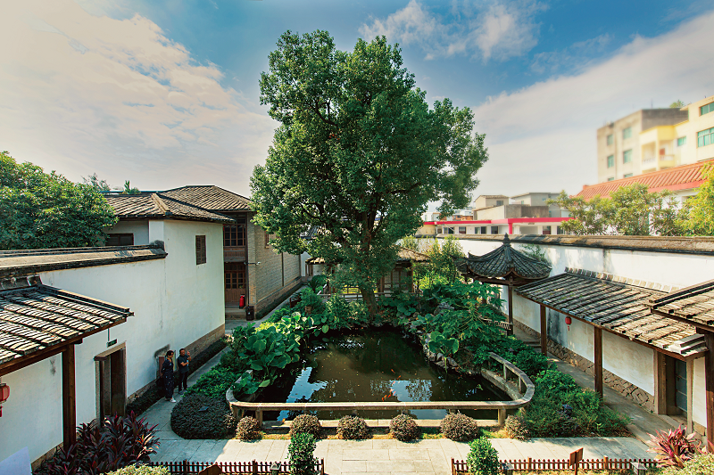 绕过主屋中堂,穿过后堂跨院院墙,便到第三进庭院,即祖宅后院。这里曾是陈景亮、陈承裘、陈宝琛祖孙三代居住生活的主要场所,也是赐书楼营建之处。较之前院,第三进后院尤显宽绰疏朗,花园式天井两侧有花厅、厢房,由披榭抄手连通至赐书楼。天井内沿南北中轴铺设石埕大道,寓意前程远大。大道两侧植有绿茵花木,架设石案汀步,嫣然惬意,东北角花木掩映间有一口古井,寓意锦上添花。