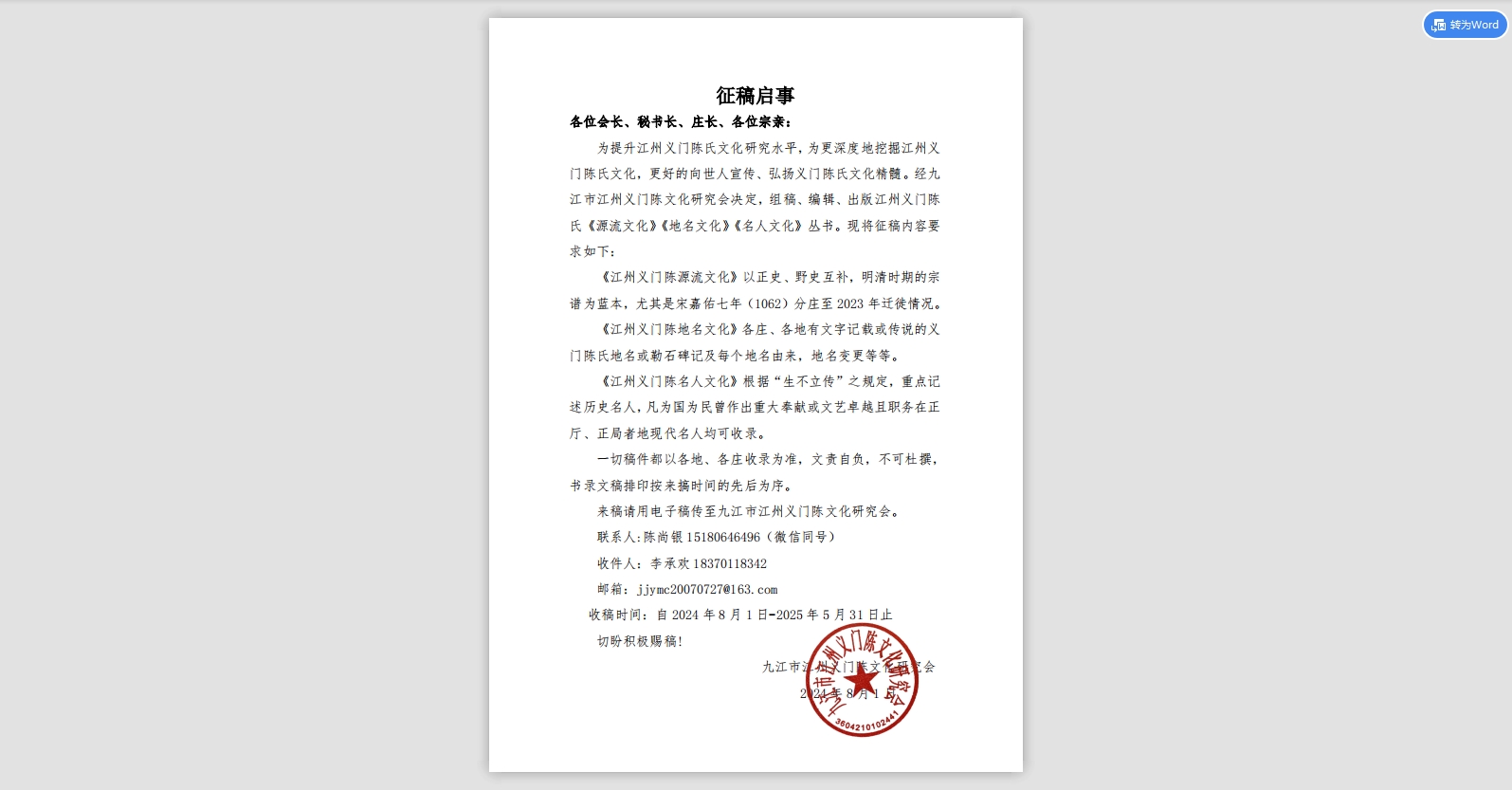 来稿请用电子稿传至九江市江州义门陈文化研究会。