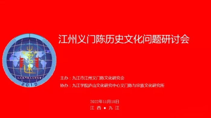 由九江市江州义门陈文化研究会举办、九江学院义门陈与宗族文化研究所协办的江州义门陈历史文化问题研讨会于11月18成功举办。因受疫情影响,会议采取线上线下同步方式展开,线下会场设在柴桑区守信田园多媒体会议室。