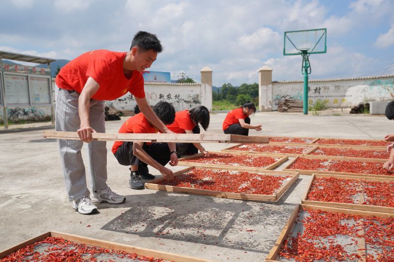 盛夏八月,三伏天骄阳似火,德安县塘山乡500亩高山辣椒种植基地迎来首批辣椒采摘,一垄垄、一片片翠绿鲜红的辣椒挂满枝头,现场一片丰收喜悦的景象。实践队的同学们与村民们分工合作、干在一起,将辣椒采摘、打包、运送、晾晒,在基层一线“自找苦吃”,切实体验劳动的艰辛与收获的快乐。