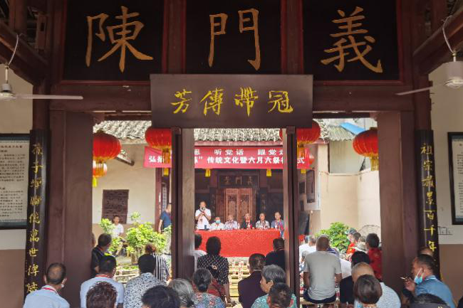 7月4日,六月初六上午,阳光明媚,洪安镇大同村陈家大院锣鼓喧天,彩旗飘飘,一片喜庆的景象。陈氏宗亲齐聚陈家大院,举行感党恩、听党话、跟党走,传承中华“义门陈”传统文化暨“六月六”祭祖活动。