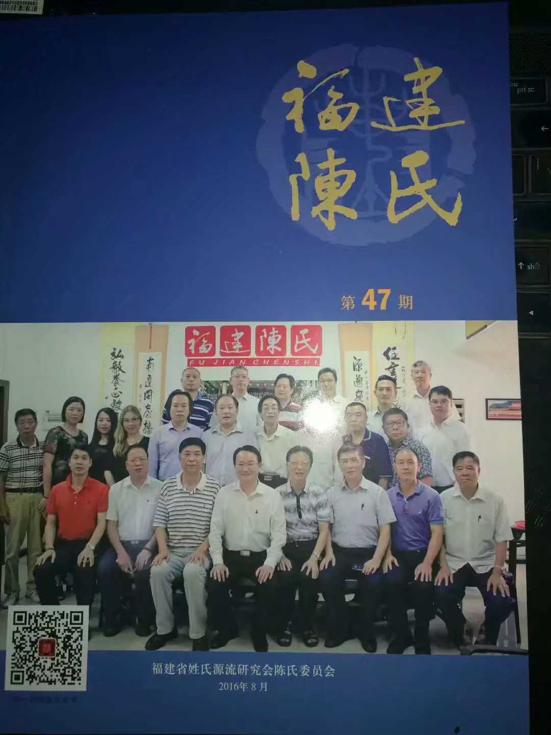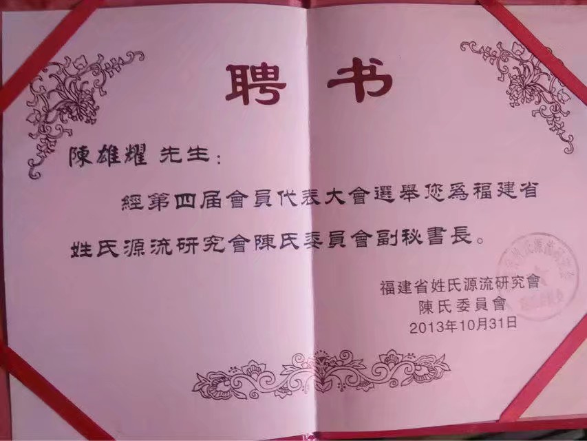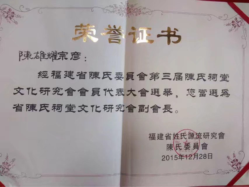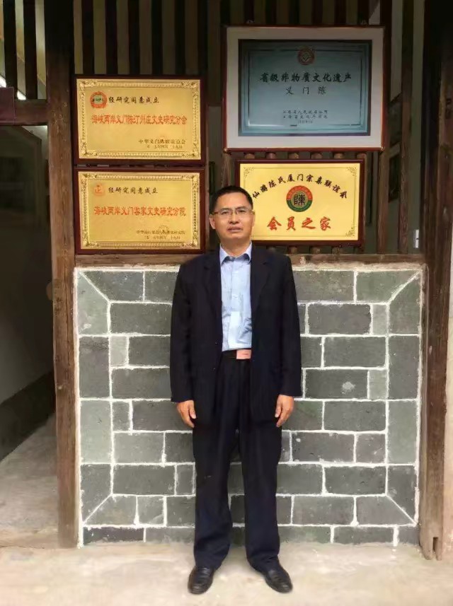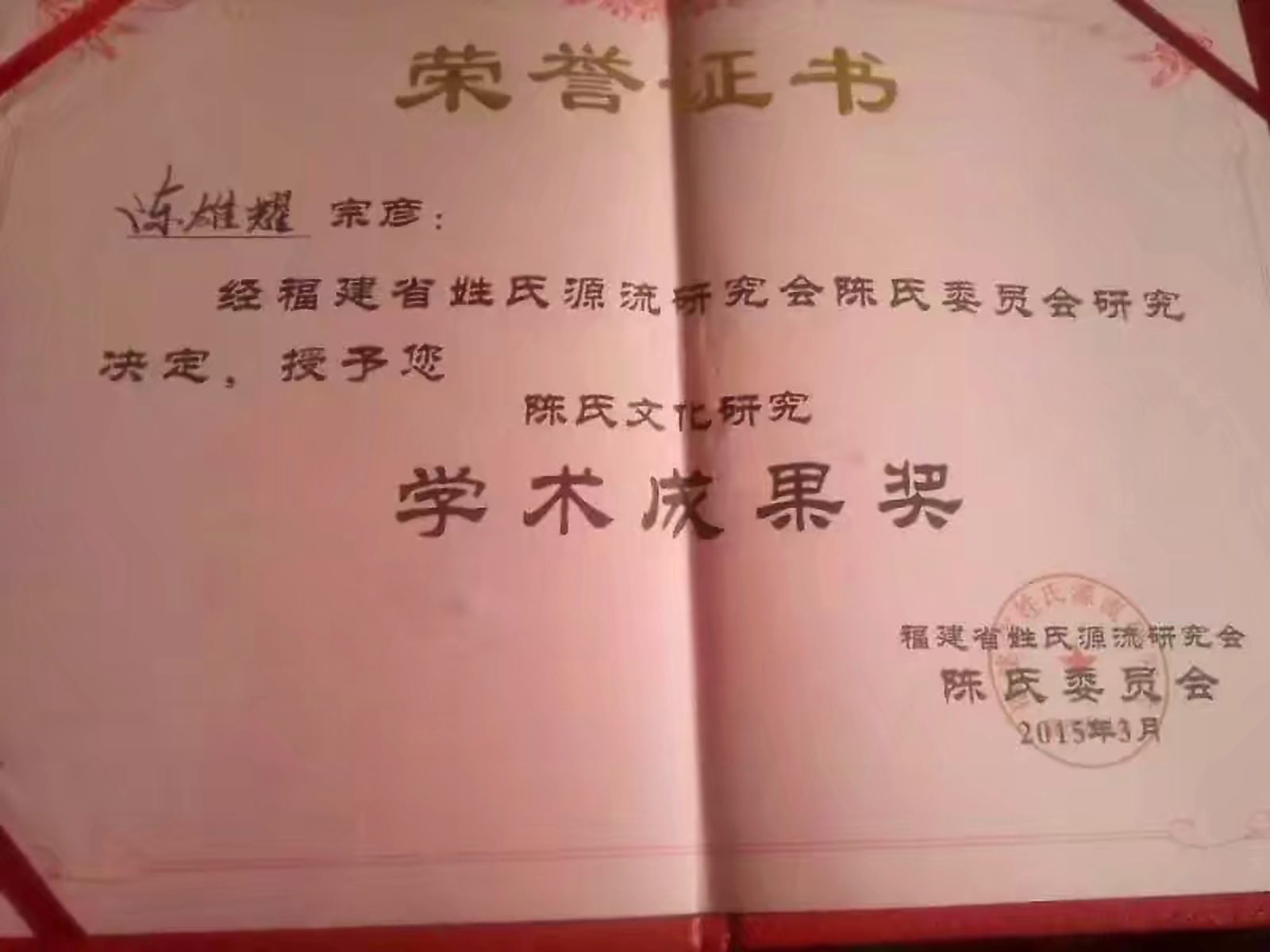 (二)族史研究经历及业绩。幼年受父辈熏陶接触族谱,对客家学与陈氏家族历史情有独钟,始终不渝从事陈氏文化的研究与传播30余年。1990年参加工作后就大量接触《永定县陈氏源流考》、《老富垅陈氏族谱》、《客家陈氏》、《中华姓氏通书:陈姓》等陈氏谱书。1996-1998年踊跃参加永定县陈氏族谱编修工作,担任总编室责任编辑及老富垅村谱编修负责人,时为永定县最年轻的编委,获“千年修谱荣誉证书”,1997-2018年担任首届永定县陈氏宗亲会委员兼秘书长,是九个班子成员中最年轻的一位。自2008年以来积极参加福建省陈氏委员会和义门陈联谊总会举办的各项会议与活动,连续在《中华义门陈杂志》、《闽台陈氏文化杂志》(即《福建陈氏》)、各陈氏宗亲网站上刊登发表文章数百篇,接待并帮助来自全国各地的许多陈氏宗亲圆满完成其寻根谒祖考察活动。2009年以来参与《八闽陈氏》、《中华义门陈氏大成谱》(总谱)、《闽台陈氏文化(祠堂卷)》、《闽台陈氏企业家风采卷》、《福建陈氏人物志》、《中华陈氏家训》、《中华陈氏大典》、《世界陈氏通谱》等的资料提供及编辑工作,出任《中华义门陈大成谱》、《八闽陈氏》、《闽台陈氏祠堂文化》、《中华陈氏大典》、《福建陈氏人物志》、《中华陈氏家训》等书籍编委.常务编委,《世界陈氏通谱》编委会主任。2010年1月倡议发起编修《中华义门陈汀州庄陈氏源流谱》,被推选为执行总编,开设陈氏QQ群、微信群及汀州庄陈氏宗亲网站,出任群主及宗亲网站站长。多次发起并组织闽粤赣陈氏宗亲大规模恭祭入闽汀始祖陈魁公活动。2013年8月自筹经费、编辑出版专著《福建义门陈》,由中国文史出版社出版发行。2015年春,与永定籍乡贤陈文辉、陈树浪、陈振家、陈鸿宁等联合发起在永定歧岭龙湖村聚斯楼成立“海峡两岸义门客家文博馆”,被聘为研究员,精心整理并提炼文博馆-“义门客家陈氏文化”各展厅文史资料。主编的《福建义门陈》、《汀州庄陈氏源流》、《义门陈汀州庄陈魁公后裔迁台概述》获2015年省陈氏委员会首批“学术成果奖”。《义门客家陈氏源流史》入编2016年中国闽台缘博物馆“谱牒文化与寻根研究”优秀论文。简历及业绩已经入编《八闽陈氏》、《福建陈氏人物志》、《闽台陈氏企业家风采》、《福建义门陈》、《世界陈氏通谱》等书籍。