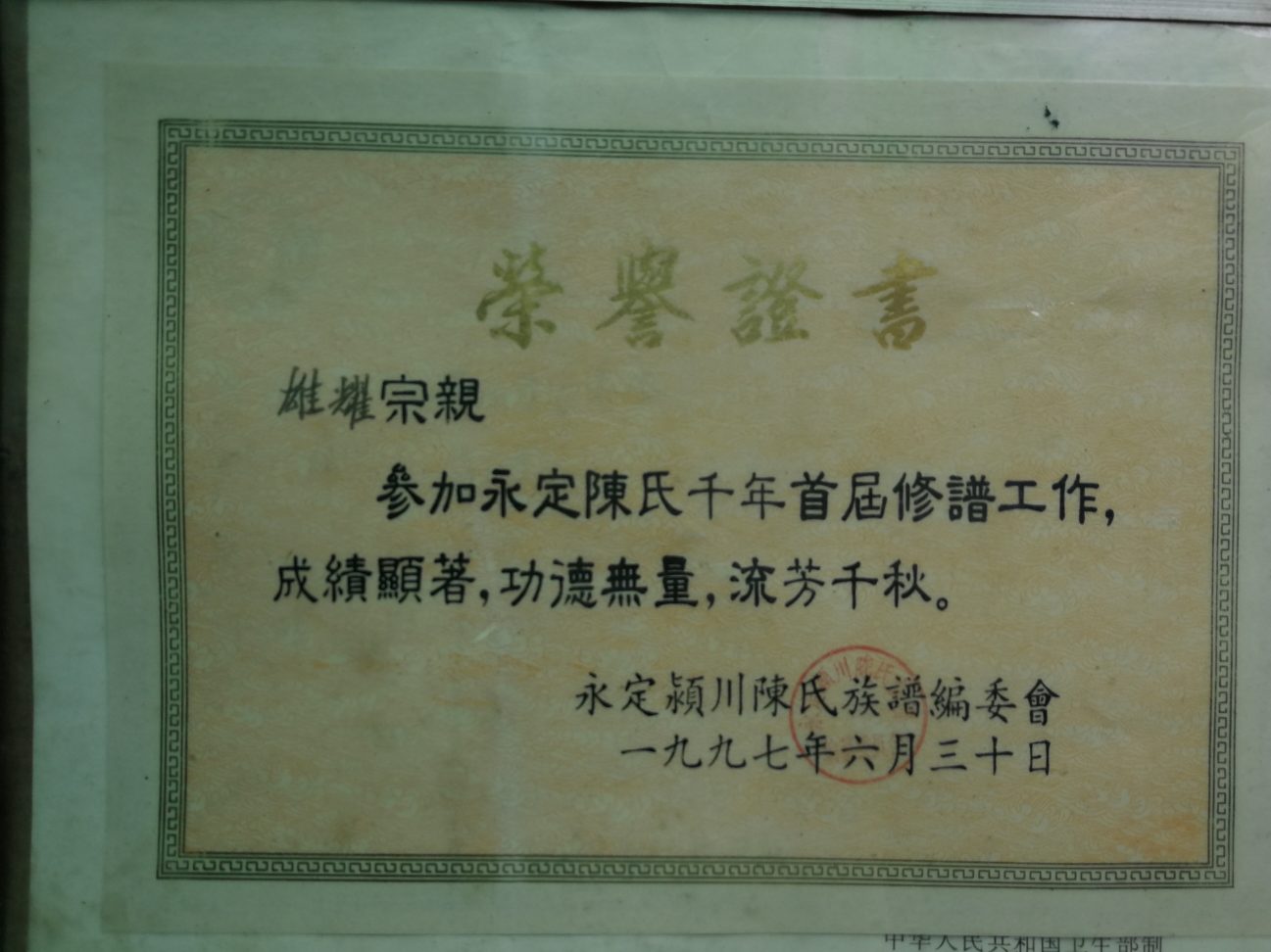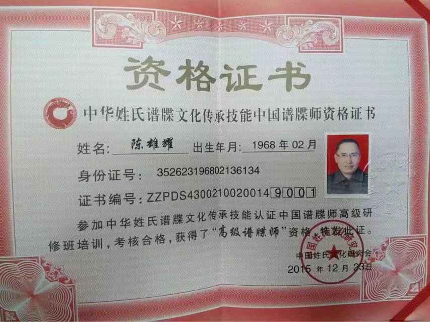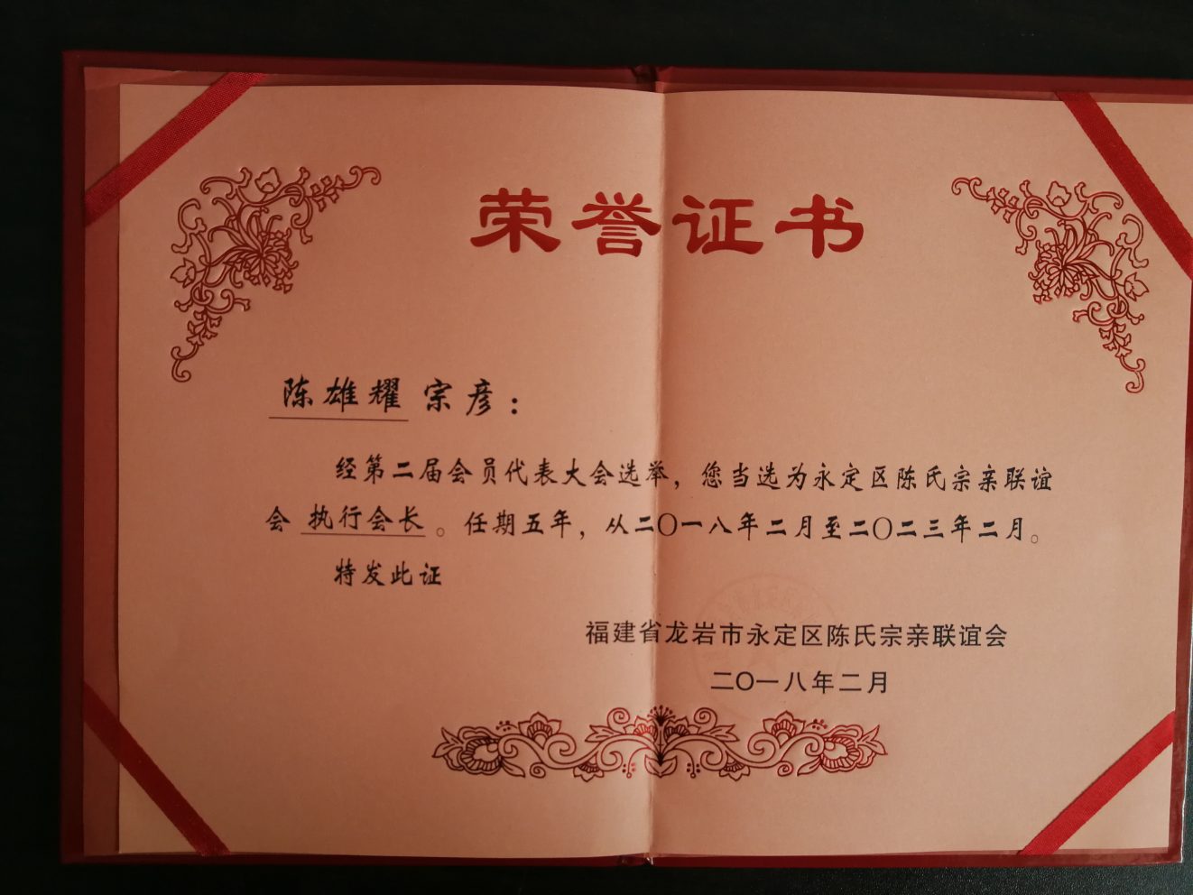 (二)族史研究经历及业绩。幼年受父辈熏陶接触族谱,对客家学与陈氏家族历史情有独钟,始终不渝从事陈氏文化的研究与传播30余年。1990年参加工作后就大量接触《永定县陈氏源流考》、《老富垅陈氏族谱》、《客家陈氏》、《中华姓氏通书:陈姓》等陈氏谱书。1996-1998年踊跃参加永定县陈氏族谱编修工作,担任总编室责任编辑及老富垅村谱编修负责人,时为永定县最年轻的编委,获“千年修谱荣誉证书”,1997-2018年担任首届永定县陈氏宗亲会委员兼秘书长,是九个班子成员中最年轻的一位。自2008年以来积极参加福建省陈氏委员会和义门陈联谊总会举办的各项会议与活动,连续在《中华义门陈杂志》、《闽台陈氏文化杂志》(即《福建陈氏》)、各陈氏宗亲网站上刊登发表文章数百篇,接待并帮助来自全国各地的许多陈氏宗亲圆满完成其寻根谒祖考察活动。2009年以来参与《八闽陈氏》、《中华义门陈氏大成谱》(总谱)、《闽台陈氏文化(祠堂卷)》、《闽台陈氏企业家风采卷》、《福建陈氏人物志》、《中华陈氏家训》、《中华陈氏大典》、《世界陈氏通谱》等的资料提供及编辑工作,出任《中华义门陈大成谱》、《八闽陈氏》、《闽台陈氏祠堂文化》、《中华陈氏大典》、《福建陈氏人物志》、《中华陈氏家训》等书籍编委.常务编委,《世界陈氏通谱》编委会主任。2010年1月倡议发起编修《中华义门陈汀州庄陈氏源流谱》,被推选为执行总编,开设陈氏QQ群、微信群及汀州庄陈氏宗亲网站,出任群主及宗亲网站站长。多次发起并组织闽粤赣陈氏宗亲大规模恭祭入闽汀始祖陈魁公活动。2013年8月自筹经费、编辑出版专著《福建义门陈》,由中国文史出版社出版发行。2015年春,与永定籍乡贤陈文辉、陈树浪、陈振家、陈鸿宁等联合发起在永定歧岭龙湖村聚斯楼成立“海峡两岸义门客家文博馆”,被聘为研究员,精心整理并提炼文博馆-“义门客家陈氏文化”各展厅文史资料。主编的《福建义门陈》、《汀州庄陈氏源流》、《义门陈汀州庄陈魁公后裔迁台概述》获2015年省陈氏委员会首批“学术成果奖”。《义门客家陈氏源流史》入编2016年中国闽台缘博物馆“谱牒文化与寻根研究”优秀论文。简历及业绩已经入编《八闽陈氏》、《福建陈氏人物志》、《闽台陈氏企业家风采》、《福建义门陈》、《世界陈氏通谱》等书籍。