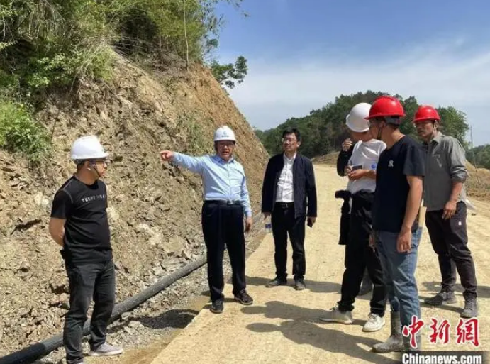 图为义门陈后裔、青岛恒星科技集团董事长陈昌金(左二)在调研项目施工进展情况 德安县委统战部供图