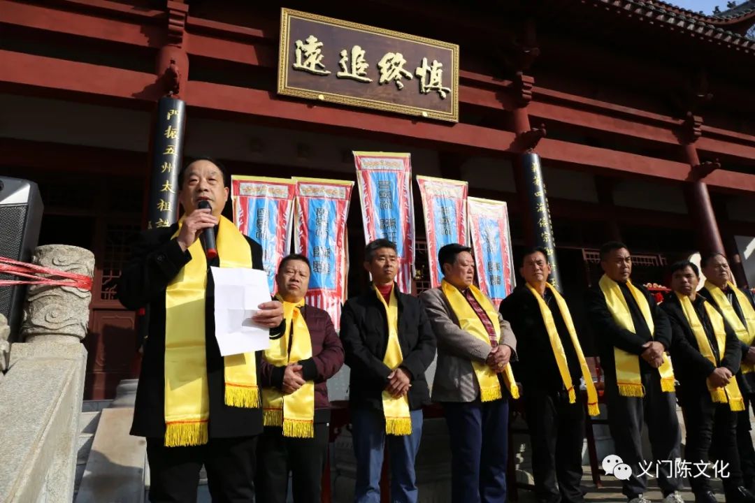 八点五十八分,五祖祠祭祀仪式正式开始。宗亲们肃立于五祖祠前,在主祭人陈德友(总会副会长),陪祭人陈贻爽(汉川庄常务副会长)的率领下,汉川庄各分会的主要负责人:陈正国(端房)、陈学明(崎房)、陈浩(岗房)、陈想桥(沔洲支系)、陈文桥(南河)、陈水祥(陈塔)、陈志雄(朝阳庙)、陈德生(梧桐)、陈志斌(江西丰城)、陈社安(杨岭)、陈树愧(武汉)等跪于祖祠前,恭迎五祖:晋国公陈旺、燕国公陈机、许国公陈感、吴国公陈蓝、齐国公陈青莅临神坛受祭。按照旧制礼仪,由汉川庄常务副会长兼秘书长陈贻爽恭颂《祭章》,其他陪祭者分别向五祖敬献五谷、鲜果、菜羹、美酒、金泊。全体宗亲向五祖敬高香,行三跪九叩之大礼,表达虔诚的尊祖敬宗之意。霎时,锣鼓喧天,大号小号唢呐声悦耳动听,鞭炮齐鸣。礼毕,全体宗亲高举"中华义门陈汉川庄(燕子湾)宗亲联谊会赴德安祭祖"的横幅,在神圣的五祖祠前合影,留下了具有历史意义的珍贵照片。