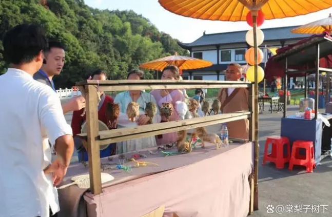旌表台广场的宋代集市,再现义门陈义门生活场景,有各种小吃摊,可以边逛边吃,观看射箭、空竹、投壶、抽陀螺等互动游戏和杂耍表演。
