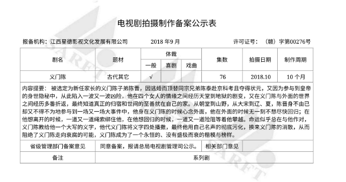 古代其它题材剧《义门陈》将于2019年播出,2018年10月拍摄,由江西星德影视文化发展有限公司制作,制作周期10个月,暂定一线卫视平台和一线网络平台播出。