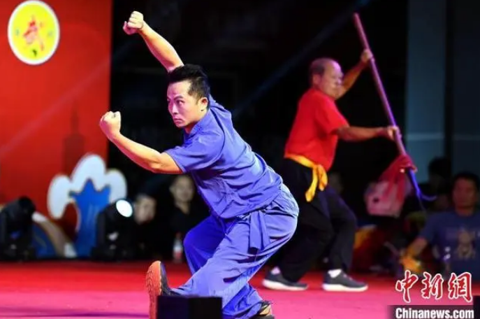 图为10月8日晚活动现场,两岸武术爱好者同台表演、交流切磋,续写两岸“武缘”。中新网记者张金川摄