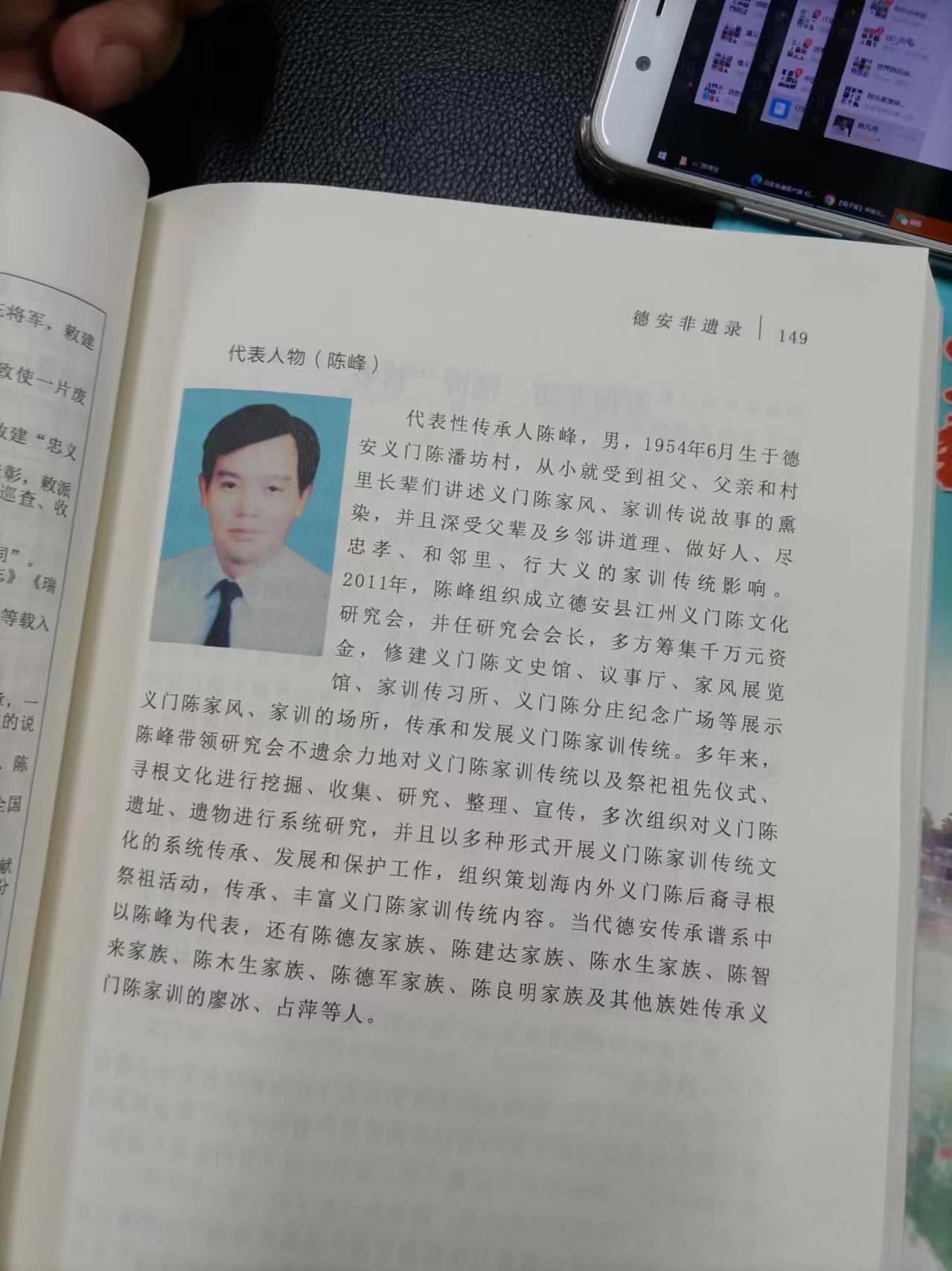 代表性传承人陈峰,男,1954年6月生于德安义门陈潘坊村,从小就受到祖父、父亲和村里长辈们讲述义门陈家风、家训传说故事的熏染,并且深受父辈及乡邻讲道理、做好人、尽忠孝、和邻里、行大义的家训传统影响。
