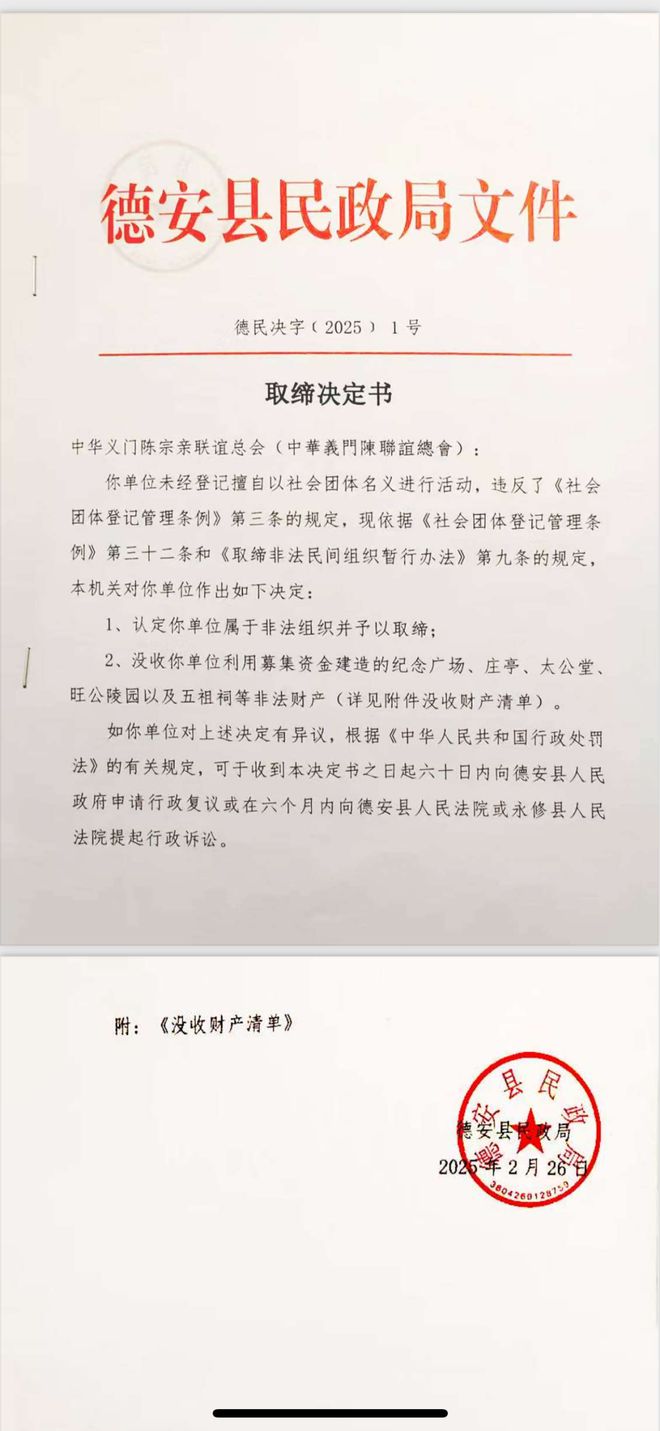 今年2月,当地民政局发出了一份《取缔决定书》,说负责这些建筑的“中华义门陈宗亲联谊总会”是个“非法组织”,他们建的祠堂、广场等也被认定为“非法财产”,要没收。这一下可炸了锅,全球三千万陈姓族人都怒了:我们自己凑钱盖的祖宗祠堂,咋就成了非法的?