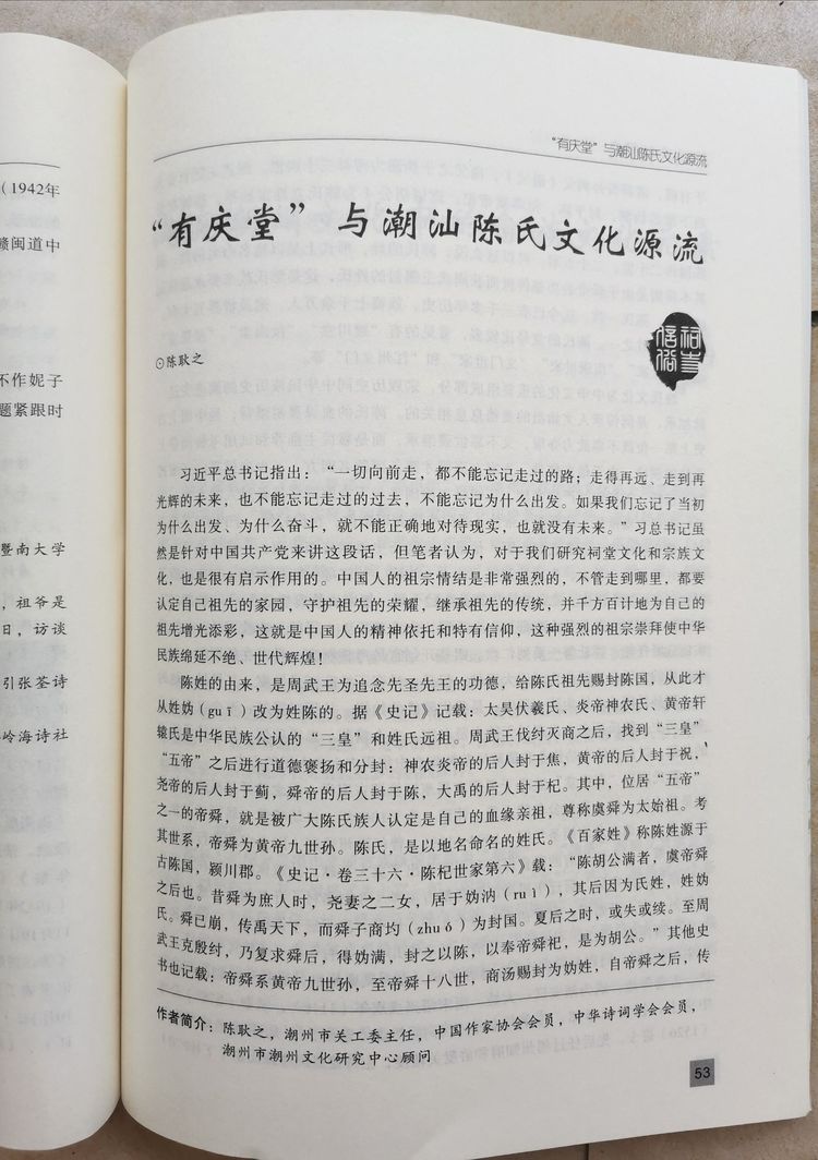 汉代陈佐主编的《陈氏族谱序》有一段话,我把它摘录下来,作为我们的共勉:“夫水之有源,木之有本,人皆见之。水源深见流长,木本固则叶茂,理势然也,况于人乎!”