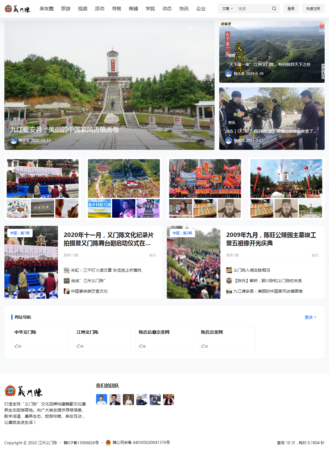 江州义门陈,致力于打造全球知名的“义门陈”文化品牌,推动赣鄱文化康养生态旅游的发展。我们为广大宗亲提供全面的寻根信息、数字活谱、康养生态、旅游攻略以及亲友互动等服务,让康养旅游融入您的生活!来江州义门陈,体验独特的文化之旅,与亲朋好友共享美好时光。